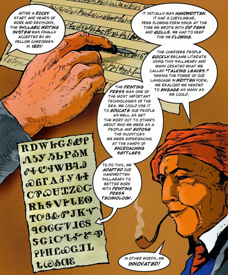RB: After finishing up Dead Eyes Open, I have contributed short stories to several other projects. One was the Trickster graphic novel, which was an Eisner nominee. Another was the Native American Graphic Classics anthology. Dead Eyes Open was reprinted in the Mammoth Book of Zombie Comics where it briefly found a second life (pardon the pun). I also did a cover illustration and graphic feature for Indian Country Today magazine about Sequoyah and the history of the Cherokee language in technology. The story was a great success, and the cover was a finalist in the American Society of Magazine Editors Cover of the Year competition. It didn’t win, but it was quite an honor to be included among other magazines such as Time, Fortune, and Newsweek.